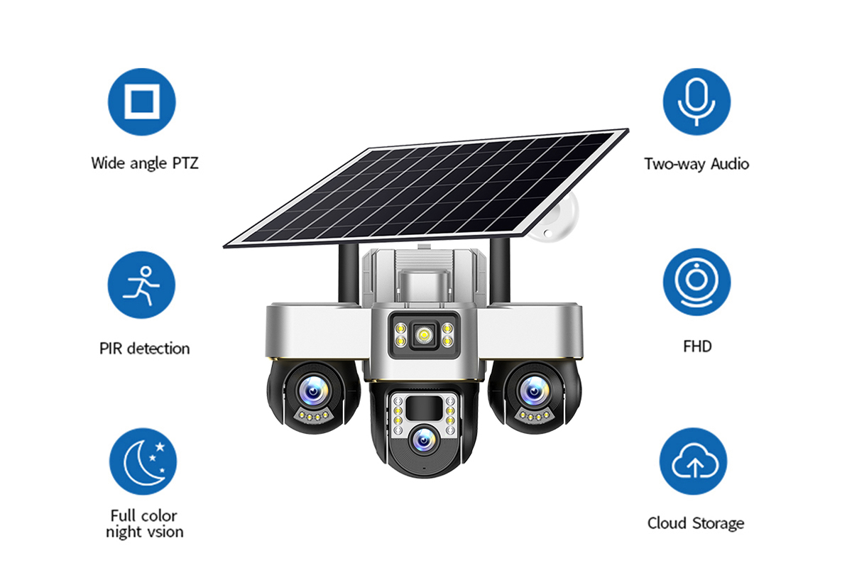 رزولوشن تصویر: ۸ مگاپیکسل مجهز به سیستم دید در شب رنگی و پروژکتور داخلی قدرتمند-هر سه لنز مجهز به موتور چرخشی مستقل (Pan/Tilt)-قابلیت چرخش ۳۶۰ درجه برای پوشش کامل محیطی-برخورداری از بالاترین استاندارد حفاظت محیطی IP67-مقاوم در برابر شرایط جوی سخت (باران، برف، نوسانات دما)-دارای پنل خورشیدی قابل تنظیم و جابهجایی برای بهینهسازی-دریافت نور-امکان انتقال تصاویر و دسترسی از راه دور به هر نقطه از جهان-قابلیت شارژ مؤثر حتی در نور کم یا شرایط ابری (شارژ با نور محیطی/ماه)-پشتیبانی از کارت حافظه تا سقف ۱۲۸ گیگابایت-استفاده از نرمافزار اختصاصی V380 جهت مدیریت انتقال تصویر-سیستم دزدگیر حرفهای با قابلیت ثبت خودکار تصاویر پس از فعالسازی-نگهداری شارژ باتری تا ۴۸ ساعت در حالت عدم تابش نور خورشید-امکان شنود محیطی (Audio Monitoring)-توانایی مکالمه و انتقال صدا به صورت دوطرفه (Two-Way Talk)-مجهز به سنسور پیشرفته تشخیص حرکت (Motion Detection)